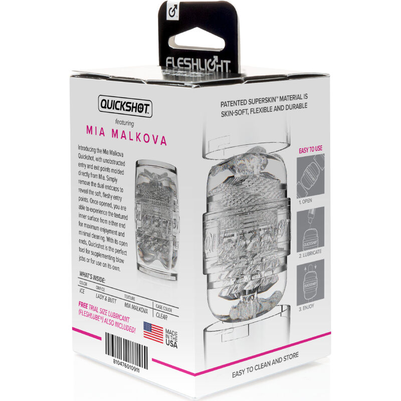 Mia Malkova Quickshot presenta puntos de salida sin obstrucciones moldeados a partir de la vagina y el trasero de Mia. El Quickshot de Mia Malkova se puede utilizar como estimulación adicional durante el juego oral de la pareja o para la masturbación.